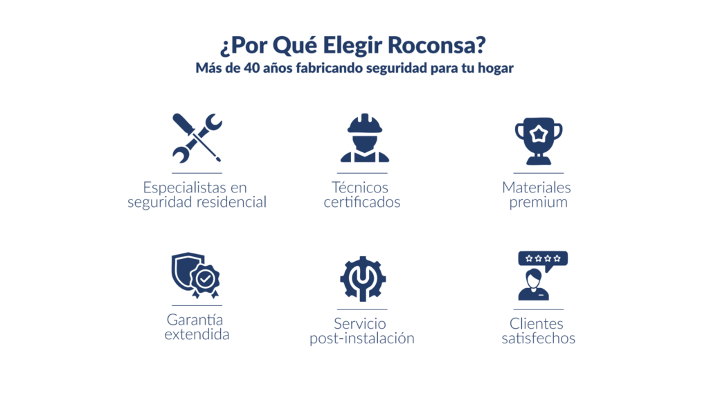 En Roconsa, llevamos años especializados en soluciones de seguridad residencial, con un enfoque en la innovación y la satisfacción del cliente. Nuestros técnicos están altamente capacitados y utilizamos solo materiales de proveedores líderes en el sector. Además, ofrecemos garantías extendidas y un servicio post-instalación para asegurar que todo funcione a la perfección.
