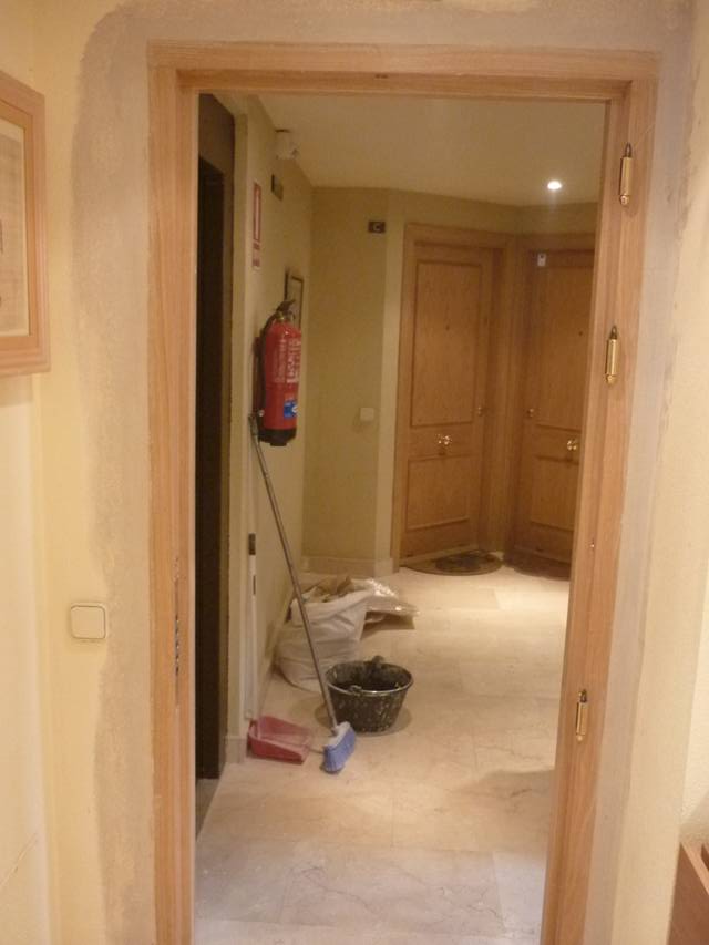 Primero quitar puerta y marco actual, dejando la pared con los ladrillos, protegiendo el suelo al quitar el marco y recogiendo finalmente todos los cascotes, tal como reflejan las fotografías del reportaje adjunto.