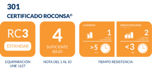 Puertas que superan RC3 según UNE 1627. También suelen calificarlas como Grado 3 de Seguridad. Su seguridad se basa en la Norma Europea 1627 y la Norma Española 85160. Superan 5 minutos de ensayo emulando a un ladrón con las herramientas que marca la norma.