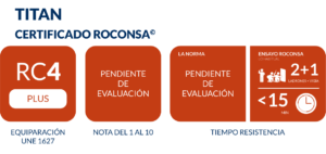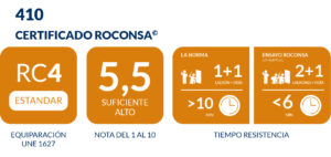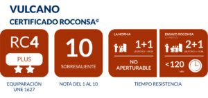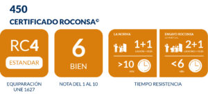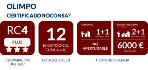 Puertas que superan RC4 según UNE 1627. También suelen calificarlas como Grado 4 de Seguridad. Su seguridad se basa en la Norma Europea 1627 y la Norma Española 85160. Superan 10 minutos de ensayo emulando a un ladrón con las herramientas que marca la norma.